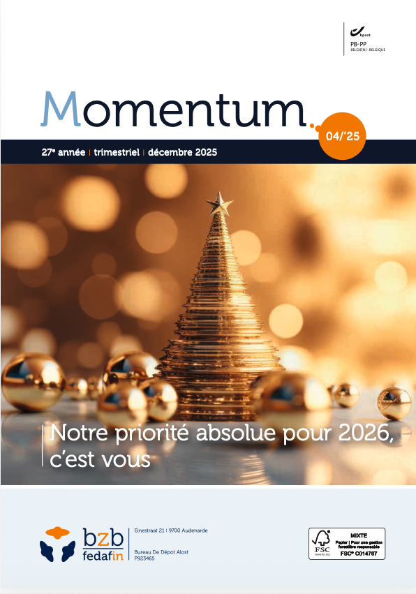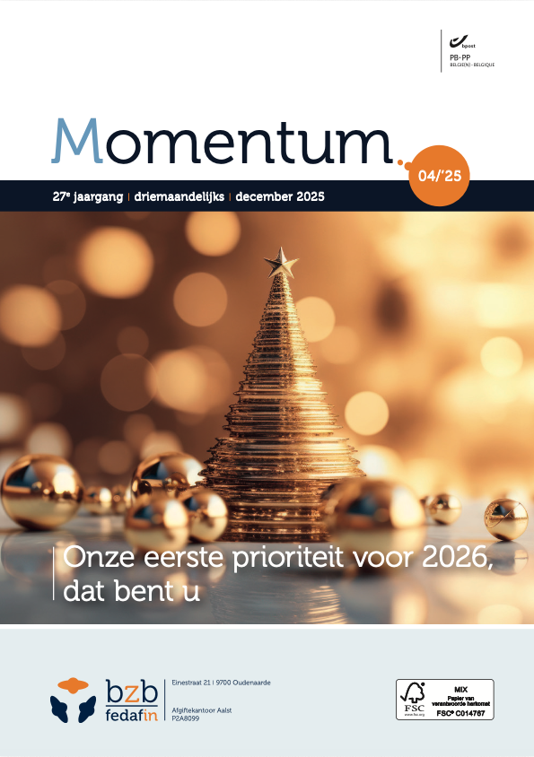 Momentum est un magazine trimestriel publié par BZB-Fedafin, disponible en néerlandais et en français. Momentum regorge de nouvelles du secteur financier, pertinentes pour l’intermédiaire indépendant. Il vous informe sur des sujets législatifs, juridiques, fiscaux, économiques et sociaux actuels. Avec plus de 8 000 exemplaires, Momentum est l'une des publications les plus lues du secteur financier.